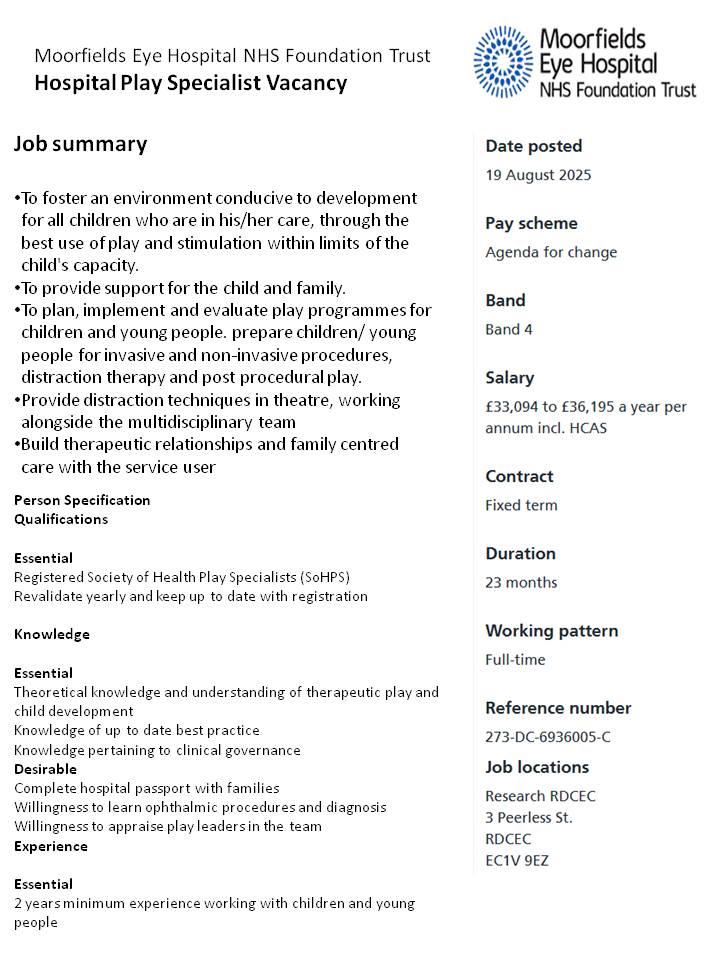 Moorfields Eye Hospital – Health Play Specialist Vacancy