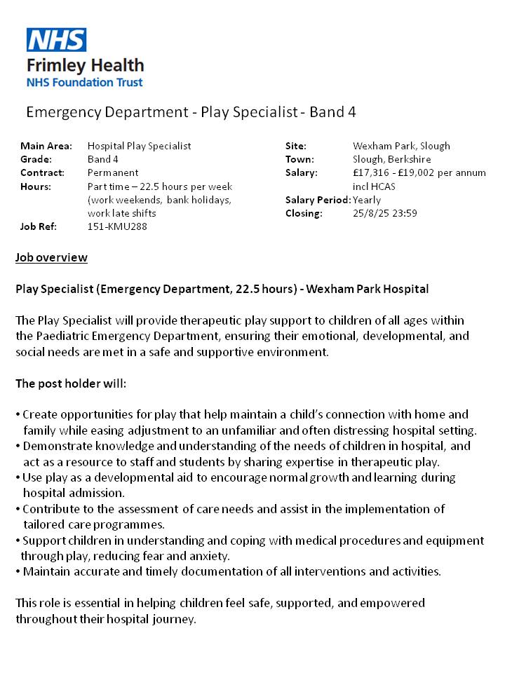 Part Time Play Specialist – Emergency Department – Wexham Park, Slough
