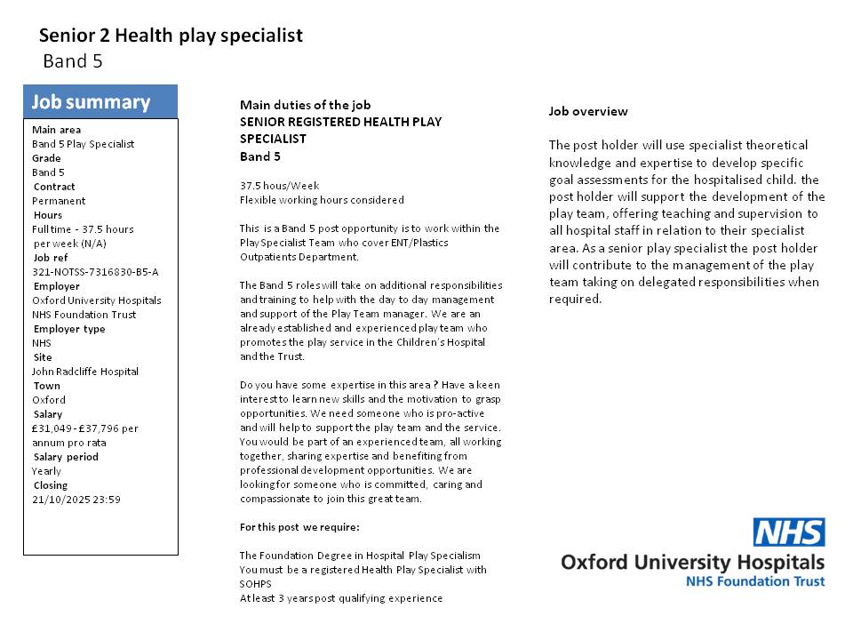 Full information can be found at: Job vacancy: Senior 2 Health play specialist, Oxford University Hospitals NHS Foundation Trust, Oxford | trac.jobs